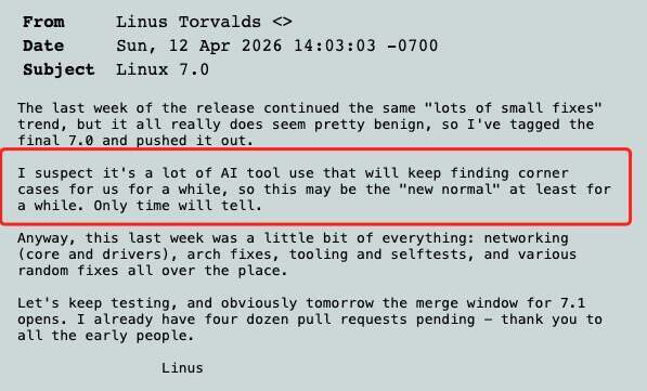 不过,这次发布说明里还是有一句话格外值得注意。Torvalds 写道,“我怀疑,接下来一段时间,大家大量使用 AI 工具,还会不断帮我们把各种边角问题翻出来,所以这可能会成为一段时间里的‘新常态’。至于会持续多久,还要再看。”