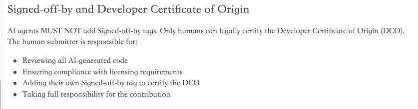 只有人类才能合法签署 Linux 内核的开发者来源证明(Developer Certificate of Origin,DCO)。这是确保代码许可合规的法律机制。换句话说,即便你提交的补丁完全由 AI 编写,责任仍然只在你本人,而不是 AI 或其提供方。