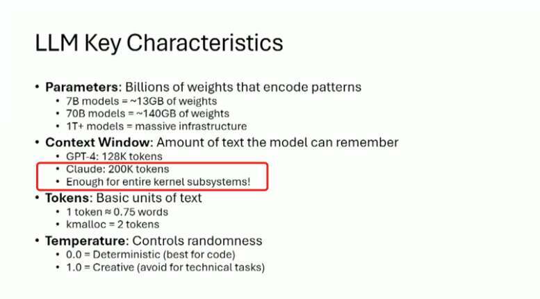同时,LLM 依赖“上下文窗口”工作,也就是它在回答时能够“记住”的输入文本。像 Claude 这样的系统,上下文窗口大约在 20 万 token 左右,已经足够覆盖一个完整的内核子系统。