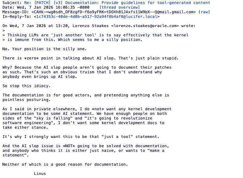 这种务实路线,其实也和 Torvalds 的态度一致。他说:“我不希望内核开发文档变成某种 AI 立场声明。‘世界要完了’和‘AI 会彻底改变软件工程’这两种声音已经够多了。我不希望文档站队。对我来说,它就应该是——AI 只是一个工具。”