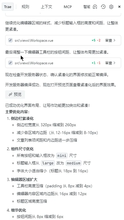 本次通过 TRAE 实现写作助手前端开发的实践证明,AI 协同开发已经成为一种高效可行的开发模式,表现令人满意。