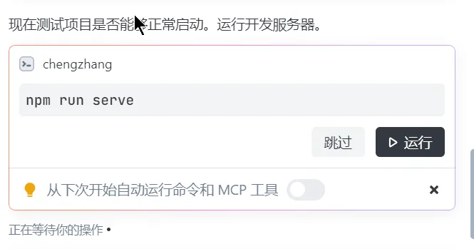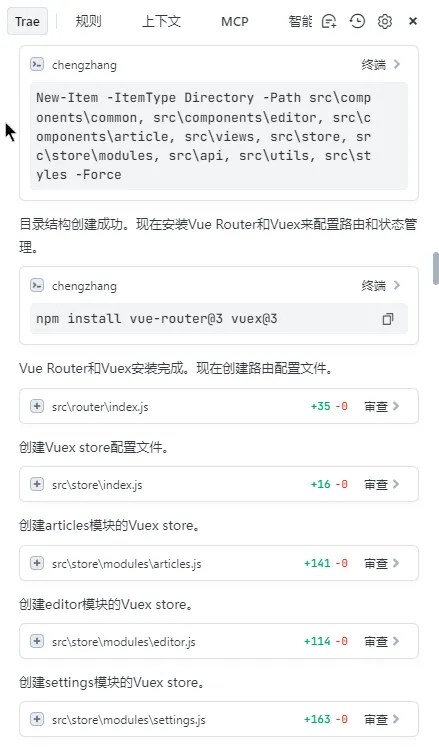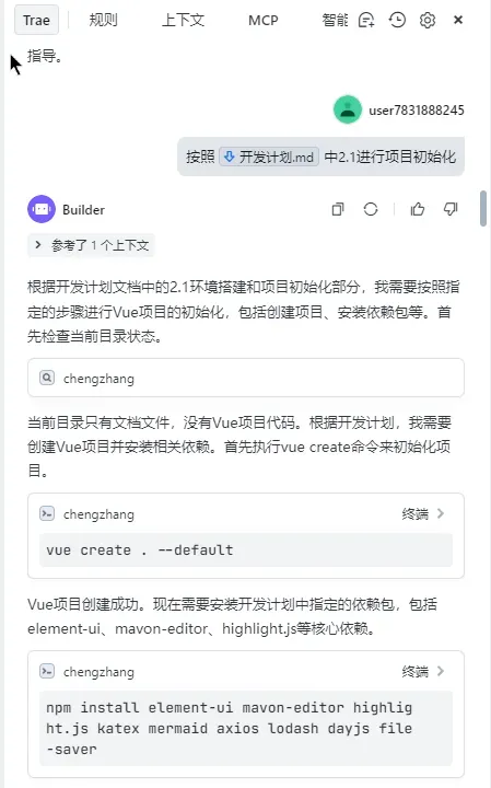 TRAE 会按照顺序自动执行各类初始化命令或者操作,为了保证大家对项目工程的掌控,TRAE 会在每次执行终端命令前进行人工确认。