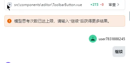 中间过程过长,会触发思考上限,需要人工“继续”。