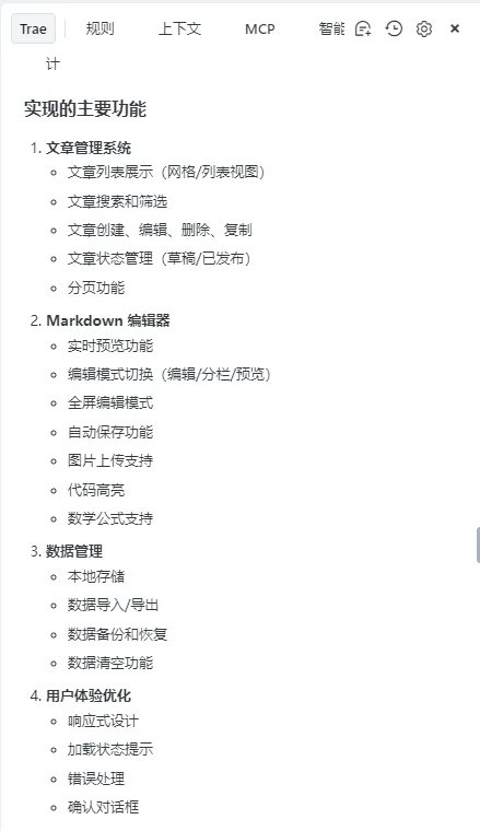 再给大家看下 TRAE 帮我实现了哪些功能。