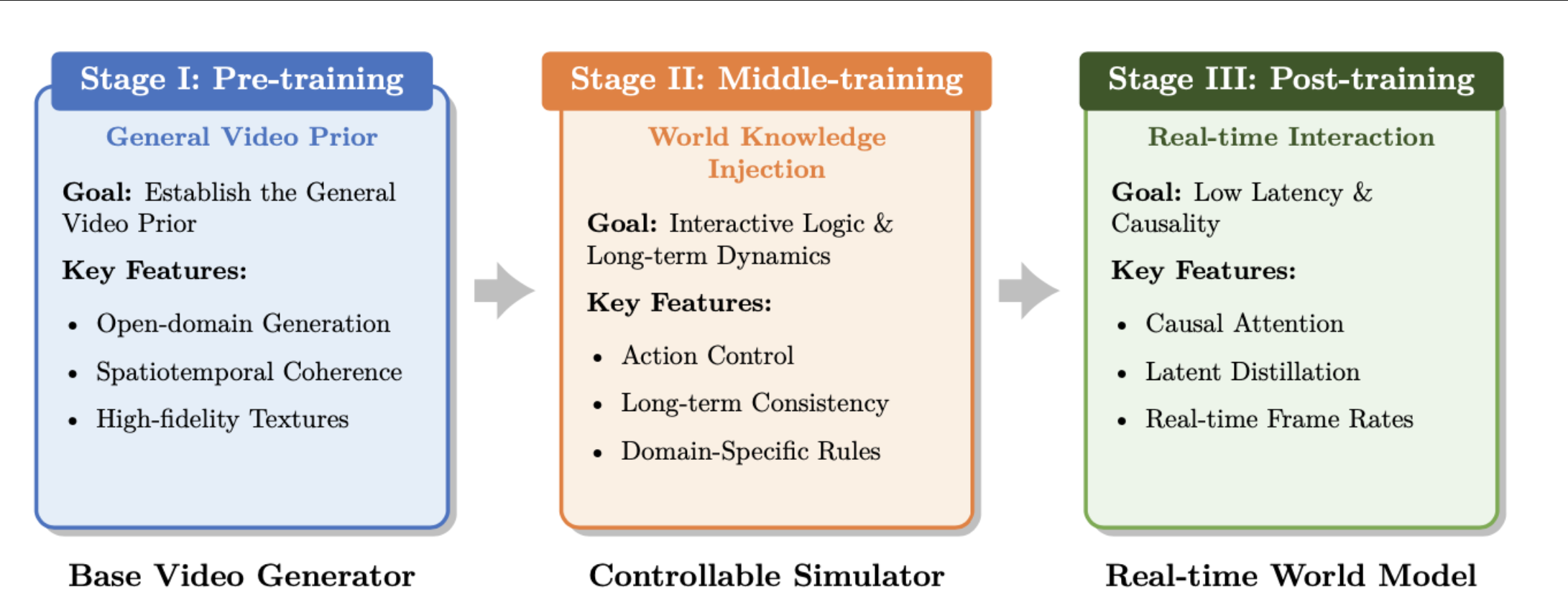 预训练负责建立稳健的通用视频先验,确保高保真开放域生成;中训练注入世界知识和动作可控性,使模型能够模拟具有一致交互逻辑的长期坚持动态;后训练使架构适应实时交互,采用因果注意力和少步蒸馏以实现低延迟和严格因果性。