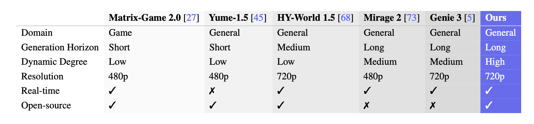 与其他交互世界模型相比,LingBot-World 在开源、提供 720p 分辨率的情况下,还保证了高动态程度和长生成跨度。