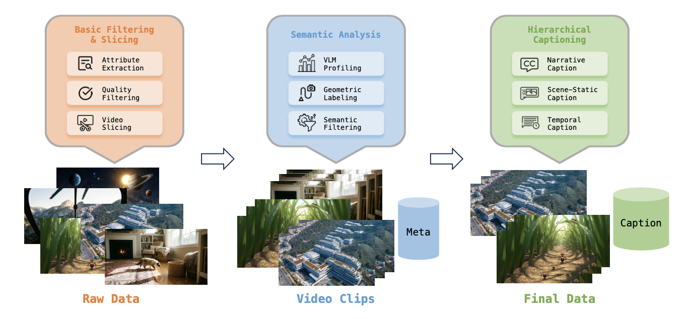 在数据处理层面,灵波团队首先对原始视频进行质量筛选与切分,生成结构清晰的视频片段;然后借助 VLM 视频的视觉质量、场景类型和视角等,结合几何标注提供必要的 3D 结构先验,产出元数据。