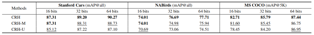 表 2 CRH 与消融变体 CRH-M、CRH-U 在三个数据集上的检索性能比较。