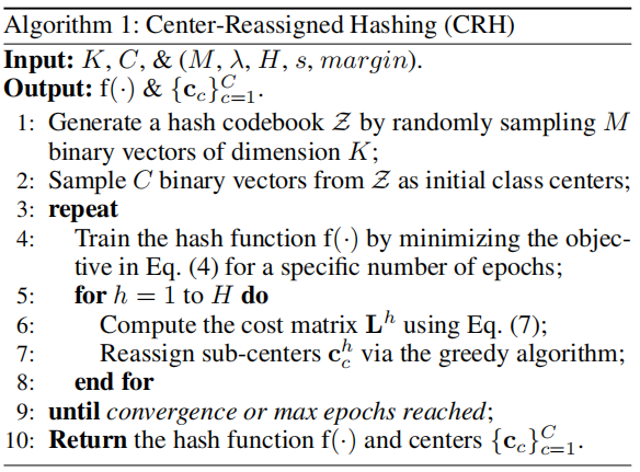 整个算法流程交替执行哈希函数优化和中心重分配,总结如下。