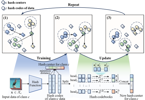 图 1 CRH 的框架图。上图:汉明空间的可视化。三张图分别表示 1)初始化 / 上一轮的数据的哈希码和中心的分配、2)经过训练哈希码靠近对应的哈希中心和 3)为每一类重新分配哈希中心,这些步骤被重复执行。下图:以单个类别 c 为例的训练时的学习目标以及多头更新机制的流程。