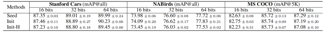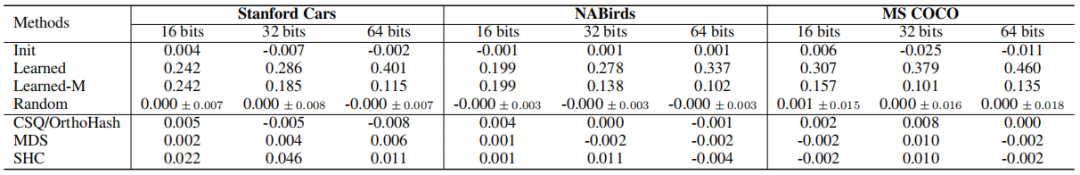 表 4 哈希中心的相似性矩阵 与参考相似性矩阵 的 Pearson 相关系数。Init 对应初始化的中心。learned 和 learned-m 分别对应多头和单头下学到的中心。Random 对应随机中心。下面是 4 个基线的结果。