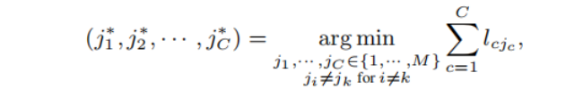 在训练过程中,定期(如每 5 个 epoch)重新分配哈希中心:基于样本当前的哈希码,计算每个类别样本与码本中心的平均距离,作为将中心分配给类别 c 的分配误差,形成成本矩阵 :