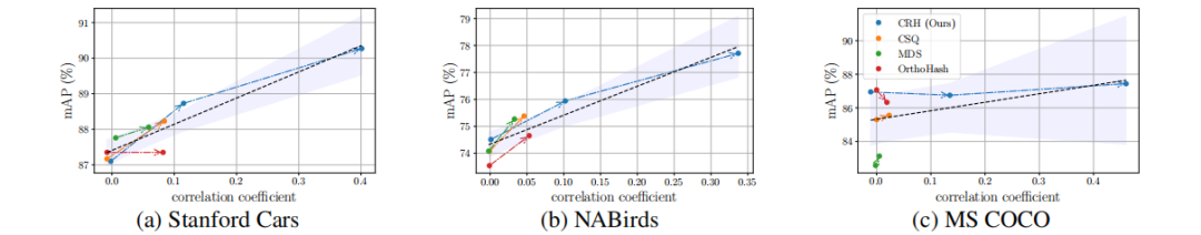 图 3 揭示了 mAP 与 PCC 的正相关关系,即更好的语义对齐通常带来更优的检索性能。
