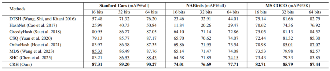 CRH 在所有数据集和码长(16、32、64 位)上均优于现有先进方法,包括 CSQ、OrthoHash、MDS 和 SHC 等。具体地,在 Stanford Cars、NABirds 和 MSCOCO 数据集上, CRH 比基线的最好结果分别相对提升了 2.1%~2.6%,4.8%~6.6% 和 0.4%~4.5%。在包含更多类别的 NABirds 上,提升尤为显著,说明 CRH 能有效处理细粒度语义关系。