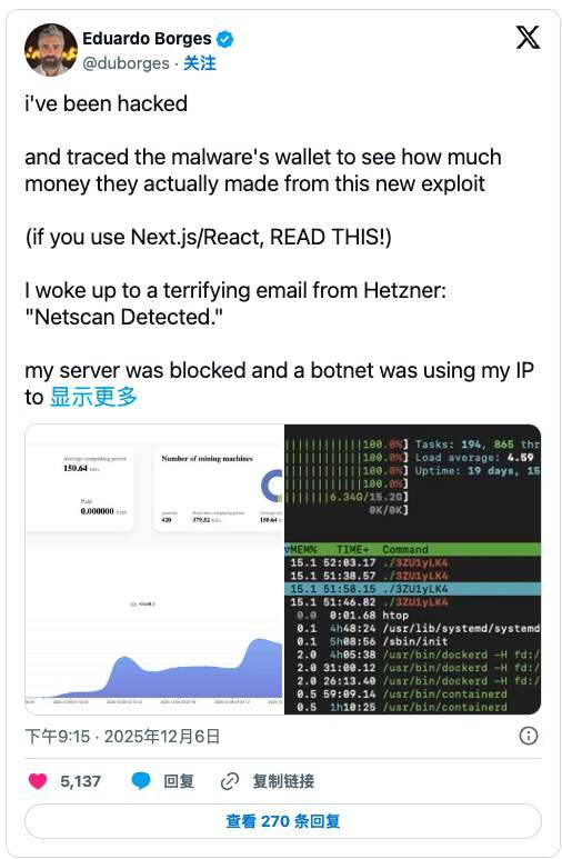 多位开发者在 X 上公开了自己中招的经历,其中就包括开发者 Eduardo。服务器被封后,他立刻排查日志,发现机器早已被“接管”——CPU 飙到 361%,可疑进程疯狂占用资源,还不断向荷兰某个 IP 发起连接:“我的服务器不再运行我的应用程序了,它在为别人挖矿!”