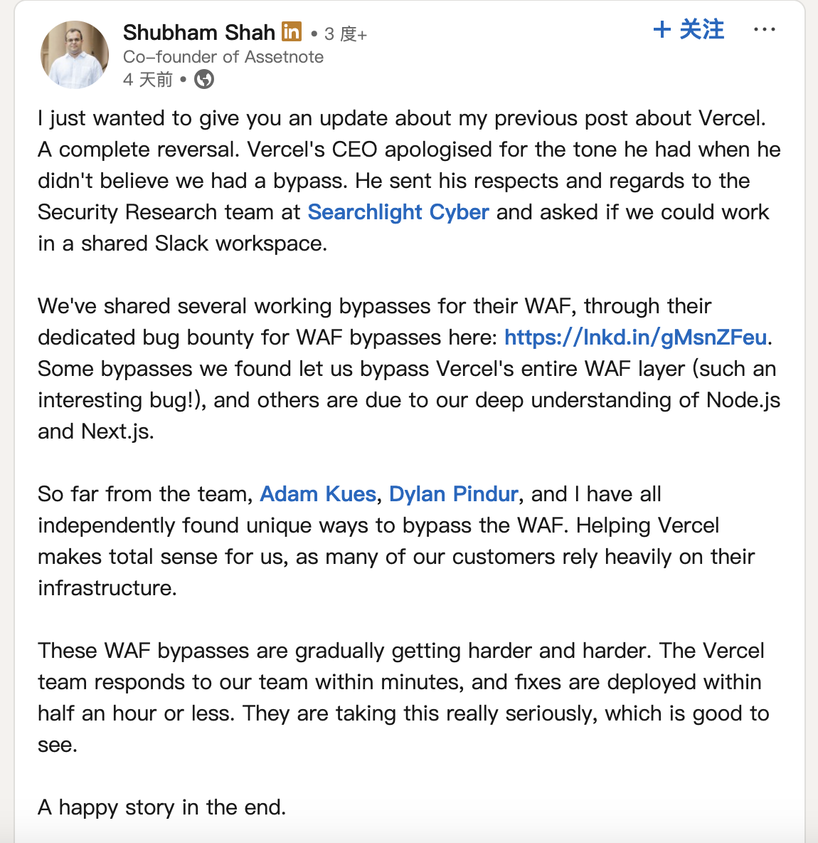 Vercel 团队在数分钟内响应了 Shubham Shah 团队的报告,并在半小时内部署修复方案。Shubham Shah 在最新的领英帖子中表示: