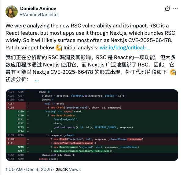 Lachlan Davidson 将该漏洞负责任地报告给了 Meta 后,Meta 随即与 React 团队协作,在短短四天内推出了紧急补丁——从实现上看,它几乎就是“补上一行代码”,却阻断了一条足以摧毁服务器的攻击链。