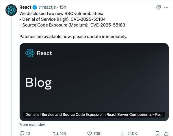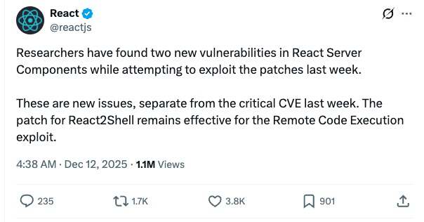 12 月 12 日,React 官方确认,研究人员在验证上周补丁时,竟又在 React Server Components(RSC)里发现了两处新漏洞。