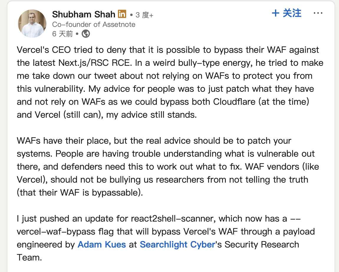 也正因为“不要把 WAF 当主修复手段”这句话戳到了痛点,业内出现了不小的争执。Assetnote 联合创始人 Shubham Shah 在领英上发文控诉 Vercel CEO 以一种近乎霸凌的态度,要求他撤下关于“不应依赖 WAF 防护此漏洞”的推文。Shubham Shah 表示: