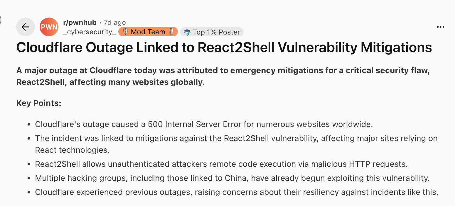 为了补救 React2Shell 漏洞带来的影响,Cloudflare 仓促推出一项变更,导致约 28% 的 HTTP 流量受到影响,大量依赖 Cloudflare 的网站返回 500 内部服务器错误,一度造成约四分之一的互联网流量无法访问。