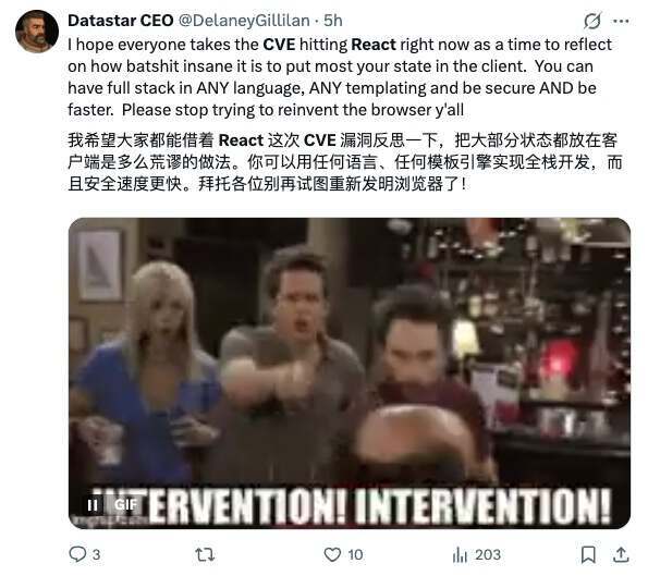 “Vercel CEO 曾试图否认其 WAF 可被绕过的事实,该漏洞涉及最新的 Next.js/RSC 远程代码执行。他以一种近乎霸凌的态度,要求我撤下关于“不应依赖 WAF 防护此漏洞”的推文。我当时的建议是:用户应当直接修补自身系统,而非依赖 WAF——因为我们当时已能绕过 Cloudflare 的防护,而现在 Vercel 的 WAF 同样可被绕过。这一建议至今依然成立。