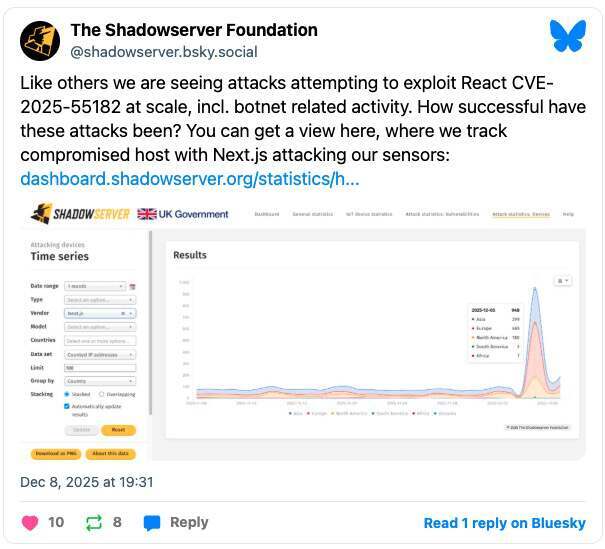 非营利安全组织 ShadowServer Foundation 表示,自漏洞披露以来,来自被僵尸网络控制的 Next.js 资产的攻击流量突然飙升 10 倍:“和其他机构一样,我们也观察到有人在大规模尝试利用 React 的 CVE-2025-55182,其中包括与僵尸网络相关的活动。”