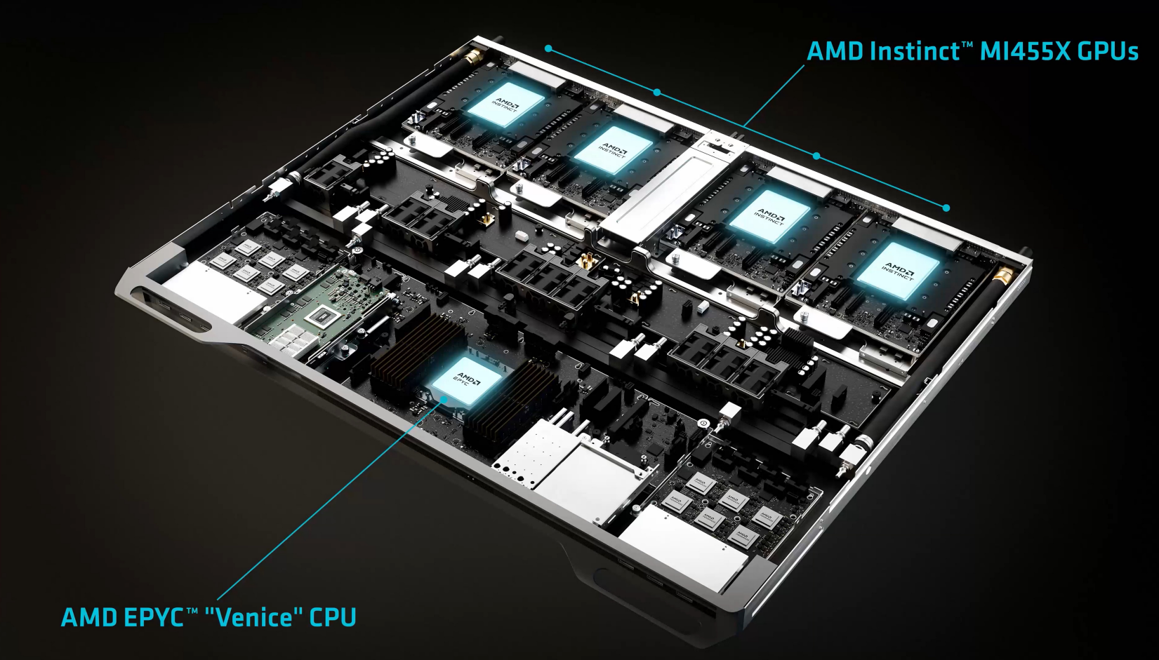 更重要的是,MI455 并不是孤立地“做一颗更强的 GPU”,它在计算托盘层面就与 EPYC 服务器 CPU、Pensando 网络芯片深度集成,让 CPU、GPU、网络协同成为平台能力,而不再是分散组件的简单拼接。