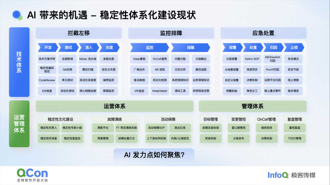 要让放大器不失真,得先搭好稳定的“电路”。我们稳定性体系本就分阶段演进,每一阶段都是下一阶段的底座;AI 也必须长在这套体系之上再去改造这套体系,否则就是无源之水、无本之木。 但是,稳定性横跨技术、流程、运营几十个小域,AI 该从哪切入?