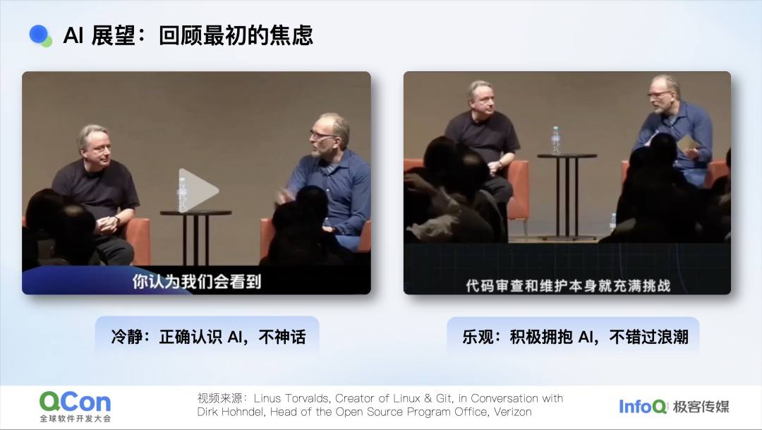 面对主持人试图把话题引向“AI 会取代程序员”的负面预设,Linus 并未接茬,反而强调:自动化工具历来只是人类能力的延伸,从机器码到汇编再到高级语言,每一次演进都让开发者走得更远;AI 也不例外——真正决定价值的,始终是我们如何驾驭它。