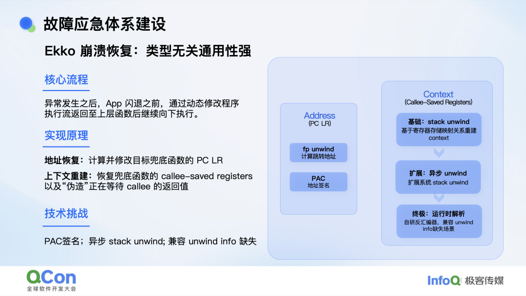 崩溃被捕获后,执行流已被打断,必须精确恢复现场:指令地址、寄存器、栈帧、局部变量,一个都不能错。我们的方案也经历了多次迭代:1.0 版基于常规栈回溯,遇到 Mach 异常就束手无策;2.0 版引入异步 unwind,又碰上因包体积优化而被裁剪的 unwind info 带来的兼容性问题;最终,我们干脆自研反汇编器,把控制权完全握在自己手里。