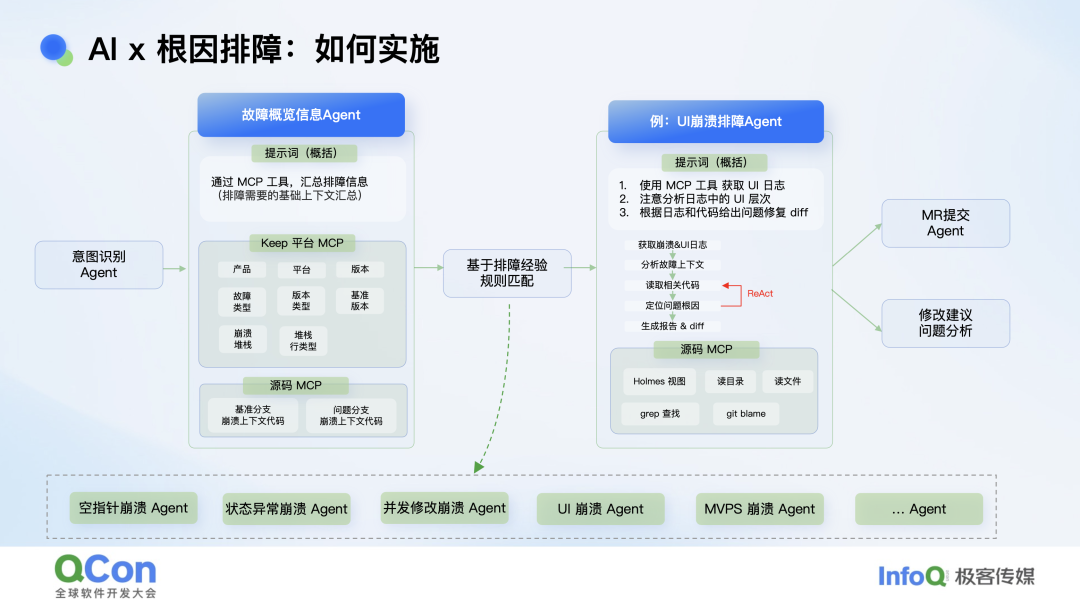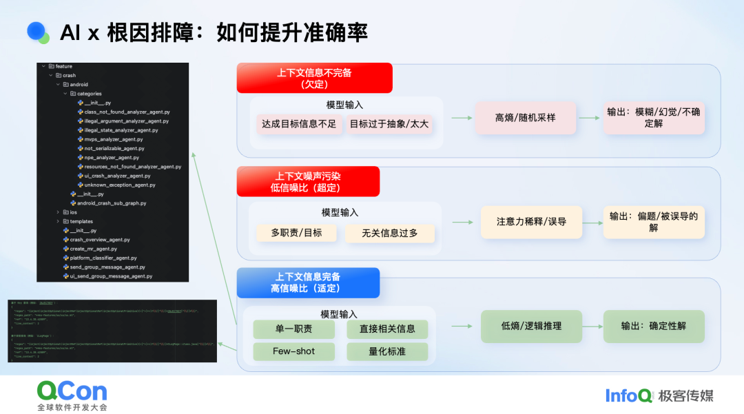 在上下文工程上,我们踩的坑可以归为两类。第一类是信息不足,目标过于宏大:直接让模型“分析一下这次崩溃”,效果往往稀碎。第二类是信息过载,职责边界模糊,模型反而迷失。用数学语言讲,前者是“欠定”,后者是“超定”,我们要的是“适定”:不多不少,刚好足够。为此,我们把问题拆成若干单一职责的 Agent,每个 Agent 的提示词都经过精心裁剪,并通过 few-shot 示例教会它如何调用私域工具。最终呈现的效果是:系统先给出根因推测,再列出排查方向。若问题简单,可直接生成 MR,一键采纳;若问题复杂,研发可沿线索继续深挖。