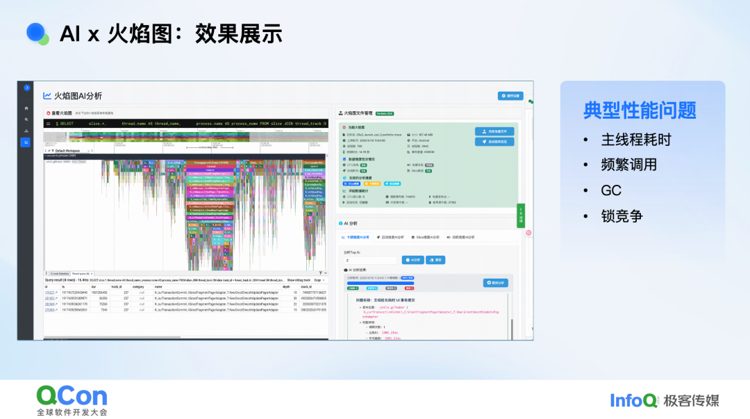我们给出的火焰图方案依旧沿用“专家经验前置”的思路:做 AI 火焰图排障的人,首先得是一位能熟练解读火焰图的性能专家。方案的核心在于数据预处理算法,如何把 60 MB 的原始火焰图压缩成可供模型高效消费的上下文,并与源码、trace 事件精准关联,从而完成粗筛,然后再又后续的处理环节按需加载必要信息进行分析。最终,火焰图分析结果按四种维度呈现:卡顿、启动、Slice 与自定义查询。系统直接给出结论,并指出对应源码位置,支持一键跳转;无需再像过去那样手动拖拽寻找瓶颈,排障路径被大幅缩短。