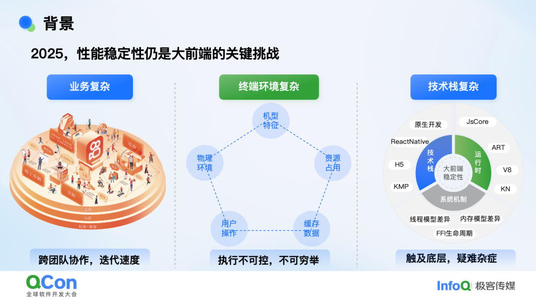 大前端的性能稳定性议题已伴随移动互联网十余年。硬件层面,iPhone 的算力较初代已提升百倍;软件层面,QCon、GMTC 年年设专场。可问题真的被完全扫清了吗? 并没有。上半年 QCon 的主题叫“越挫越勇的大前端”,下半年又变成“AI 与跨端的高效融合”——主题本身就在暗示:复杂度并未消解,我们仍在受挫,效率依旧不足。若用算法复杂度打比方,过去十年我们面对的场景和其解决算法本身并未升级,且复杂度还因鸿蒙等新变量持续膨胀水涨船高,输入规模也增加了。因此,我们确实面临不小的挑战。