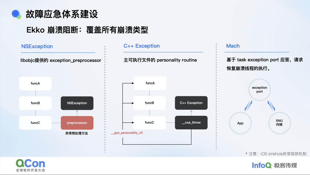 行业里曾有一种前置 Hook 方案,但它必须在异常发生前就介入,对所有用户生效,哪怕他们从未崩溃,Ekko 规避了这个缺点。Ekko 与行业方案的最大区别,在于它是“事后”的:只有当用户真正崩溃时,才进入兜底流程,从而把对正常用户的干扰降到零。 这听起来简单,实现却层层递进。以 NSException 为例,我们注册 exception_preprocessor;C++ 异常则要 hook personality routine;Mach 异常还得与内核通信,难度逐级升高。