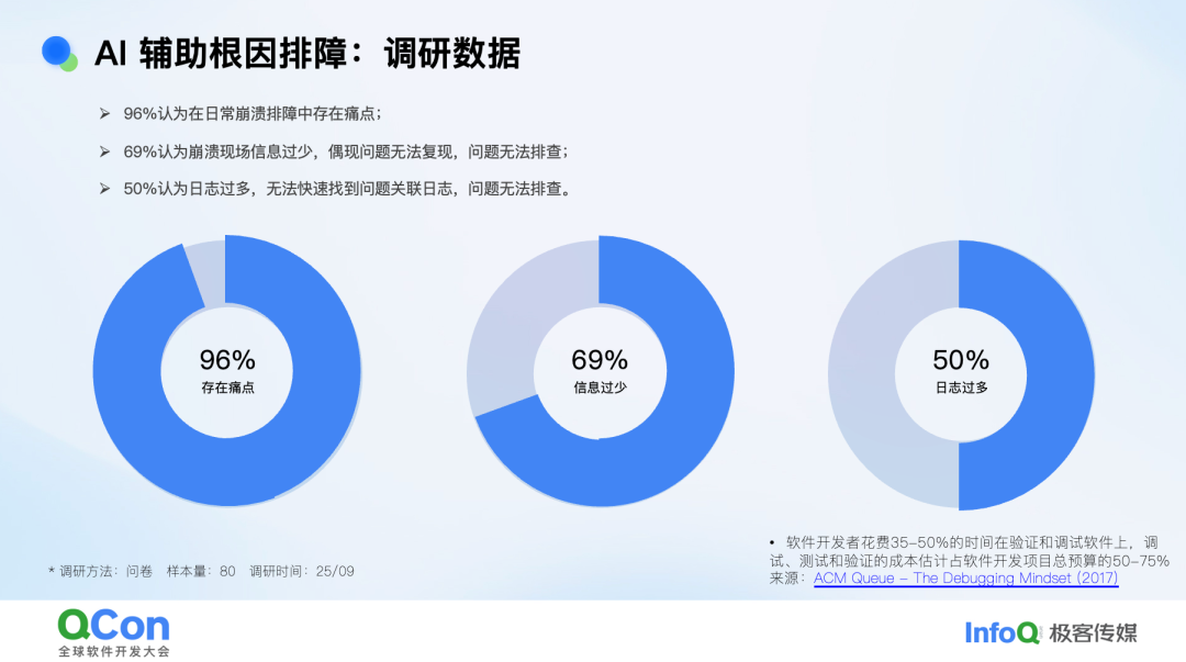 在动手之前,我们先对研发同学做了一次摸底:96 % 的人承认线上排障痛苦,却又在不出事时抱怨日志太多,出事后嫌日志太少。刚刚前面友商的演讲可以看到,工程师 60 % 的时间花在修 Bug 上;我查到的 ACM Queue 报道数据也落在 30 %–50 % 区间。两相映照,可见“写代码易,排障难”并非个例。