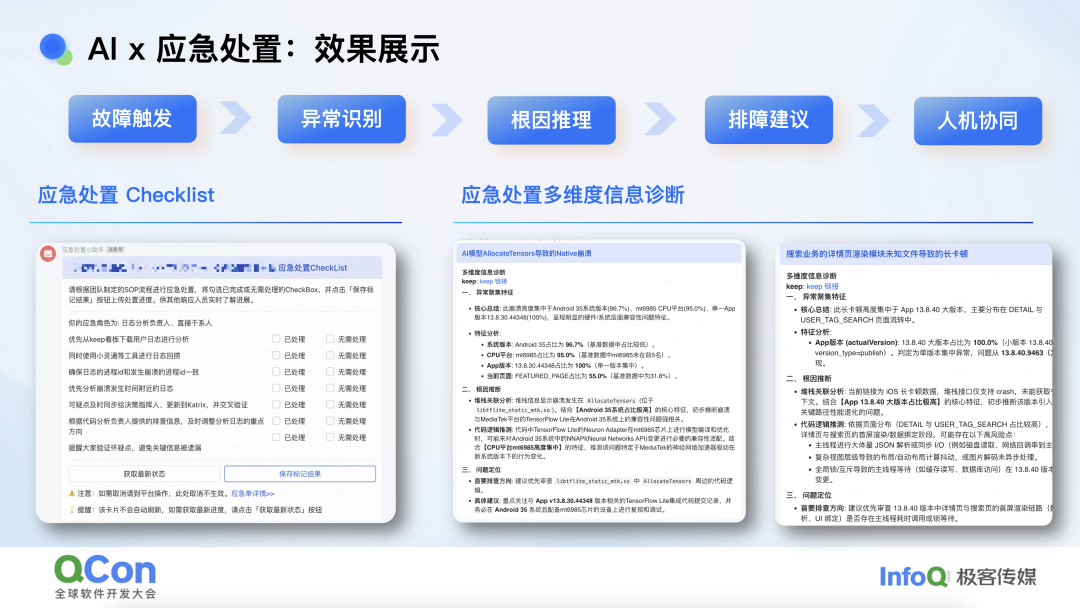 直接看效果。第一,Checklist:你现在很紧张,就按我们处理了一年几百次报警总结出的步骤一条条列出来给处置建议,防止遗漏。第二,问题总结:崩溃上报字段有 100 多个维度,人眼看肯定漏。很多问题其实有维度特征,比如展示图里提示“Android 35、高通芯片”等限定条件,有了这些信息,第一步定界就很快。第三,在给出维度后,继续提供源码级分析,并推送可能的修复方向,省去人工翻查。