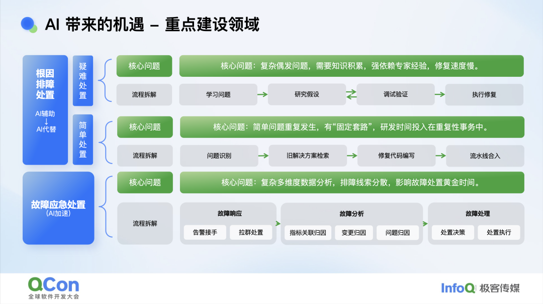 内部多轮推演后,我们锁定“问题处置”——它最吃研发时间,也最影响用户体验,且能弥补人在排障时处置时的盲区(研究表明人脑同时做多处理四个变量)。 具体拆成两条线:根因处置与应急止血;根因里又分疑难与简单两类,恰好与大模型的推理、检索、生成能力相呼应。
