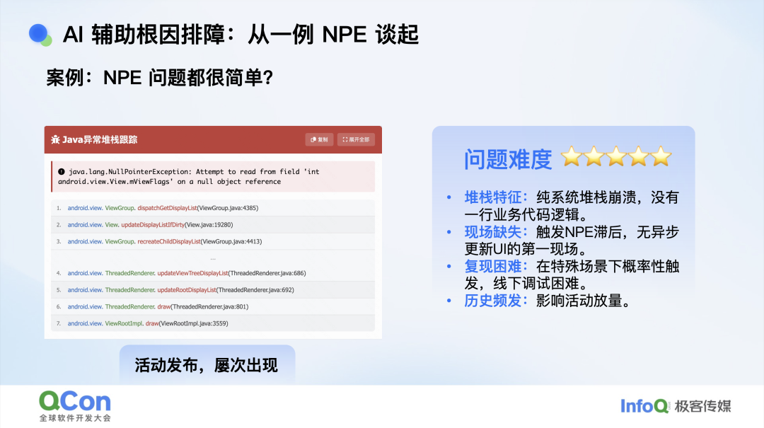 前面谈了“为什么”与“怎么做”,接下来我想用一次真实案例回答“我们到底做了什么”。案例是一枚被内部戏称为“五星 NPE”的异常。乍看只是空指针,加个判空似乎就能了事;可它偏偏只在大型活动爆发,且堆栈里只剩系统帧,连崩溃触发源头都无处寻觅。 把日志丢给 ChatGPT、Claude 或 DeepSeek,它们同样抓瞎,因为上下文太少,推理链断裂。那么,通过我们的工具链能定位出问题根因吗?
