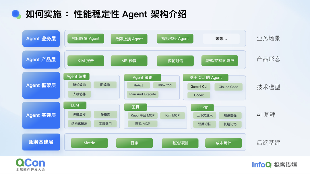 我们自顶向下设计了一套可扩展的 Agent 架构,搭建了「柯南 AI」平台。业务目标明确:把根因定位与应急响应做得更快、更准。产品形态先以内部 IM 机器人落地,支持问题根因排查建议 和 MR 自动修复;再逐步演进为嵌入 IDE、Coding Agent 、内部排障平台多轮会话。技术选型上,Agent 框架我们的发展经历了两个阶段:从 AutoGen 到基于 OpenAI Agent SDK 原语自研 Agent 框架,支持图编排、多种模式策略,也能接入和各 CLI Agent 结合。 基建层分两头:AI 侧按场景选模型——简单任务用轻量模型,推理密集型上强模型,多模态场景再叠加视觉能力;同时把推进内部平台 MCP 化演进,让工具随调随用。服务端同样关键:系统必须可观测、可调试、可压测,还要提前算清成本,避免规模上去后失控。