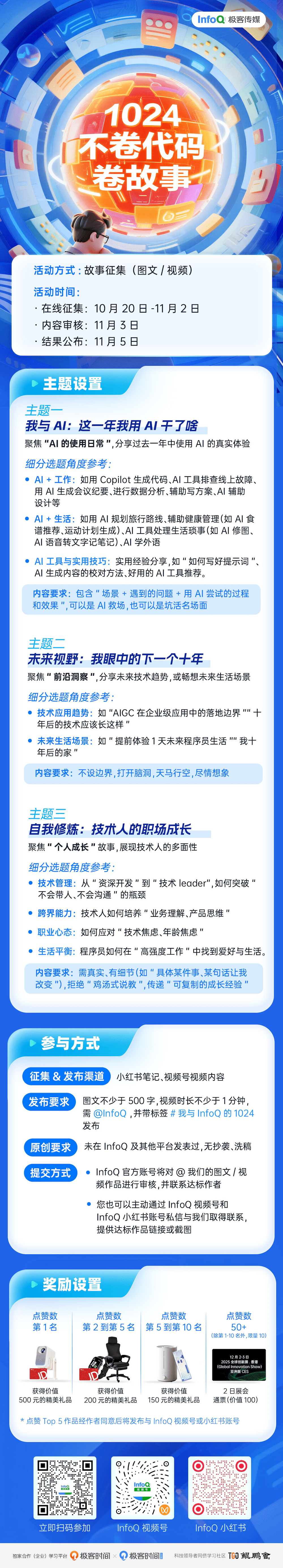 当 1024 这个专属技术人的数字闪耀登场,一场聚焦分享与成长的线上狂欢正式拉开帷幕!今年 1024 程序员节,InfoQ 重磅发起全场景内容征集活动,无论你是玩转 AI 的技术达人、脑洞大开的未来畅想家,还是在职场中不断突破的奋斗者,都能在这里晒出你的独家经历,赢取丰厚大奖,解锁程序员节的别样精彩!