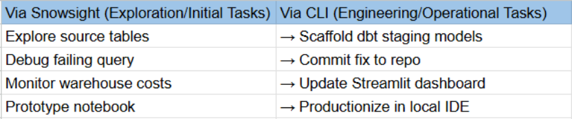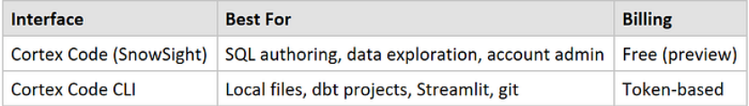 经验法则:在 Snowsight 内的 Cortex Code 中开始探索与分析;当需要本地文件持久化存储或 Git 集成时,迁移至 Cortex Code CLI。
