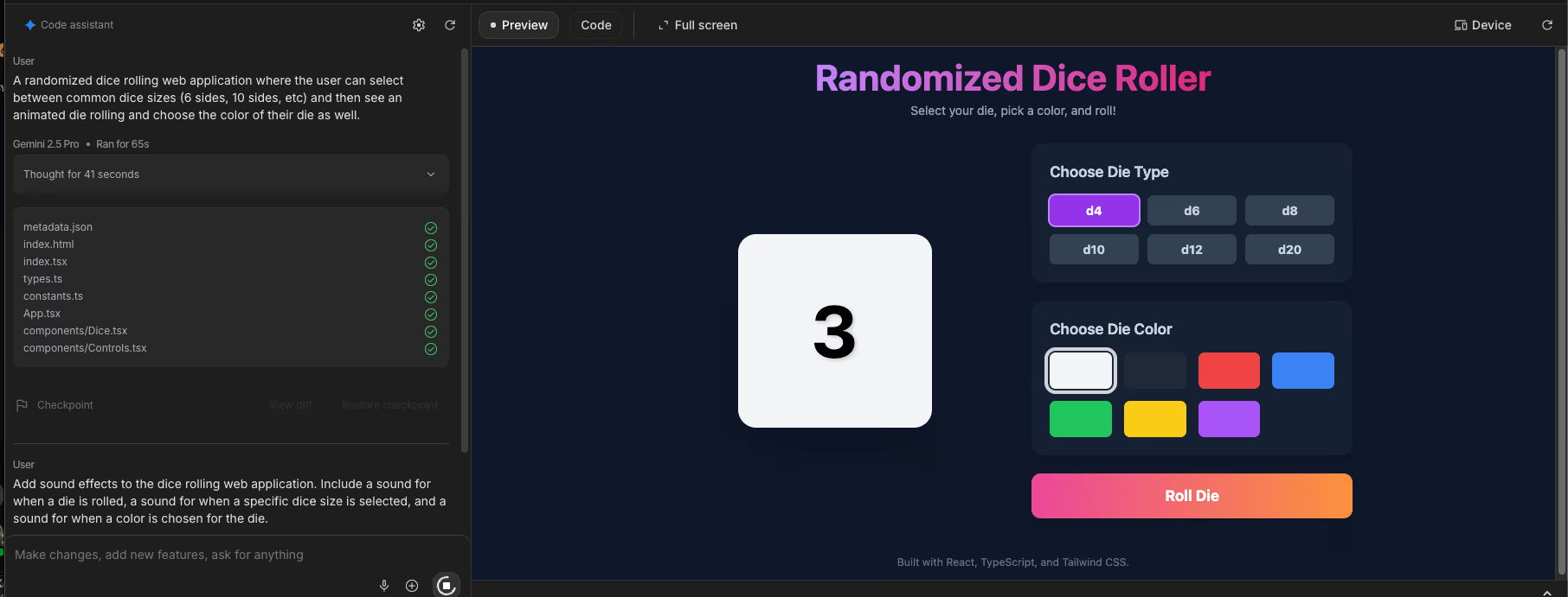 有网友用 AI Studio 试构建应用,只在提示框敲下两句需求:做一个随机掷骰子的网页应用;可选常见骰子面数(6、10 等),有滚动动画,还能改骰子颜色。第 65 秒,页面已成型:上方是 d4/d6/d8/d10/d12/d20 面数选择器,旁边是颜色选择器,中间的骰子一键即滚,动画结束即时返回随机点数。