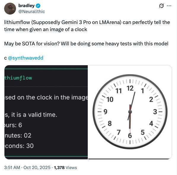 10 月 20 日,公共测试平台 LMArena 短暂出现了谷歌两款神秘新模型,代号 “lithiumflow” 与 “orionmist”。业界普遍猜测,它们分别对应 Gemini 3.0 Pro 与 Gemini 3.0 Flash 的预发布版本。
