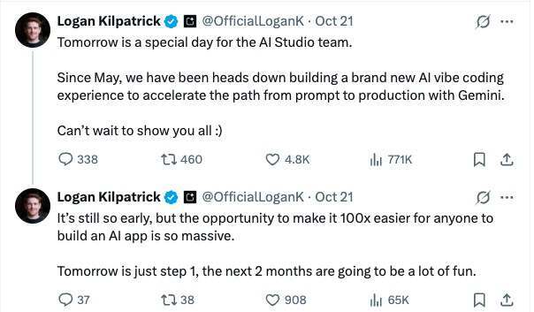 Google AI Studio 产品负责人 Logan Kilpatrick 在发布前夜表示:“这只是第一步,接下来两个月会非常有意思。我们的目标是将人人搭建 AI 应用的难度再降两个数量级。”Kilpatrick 曾任 OpenAI 开发者关系负责人,去年 4 月加入谷歌出任 AI Studio 负责人。他入职谷歌后就没闲着,一直在 X 上持续发布 AI Studio 的密集更新。