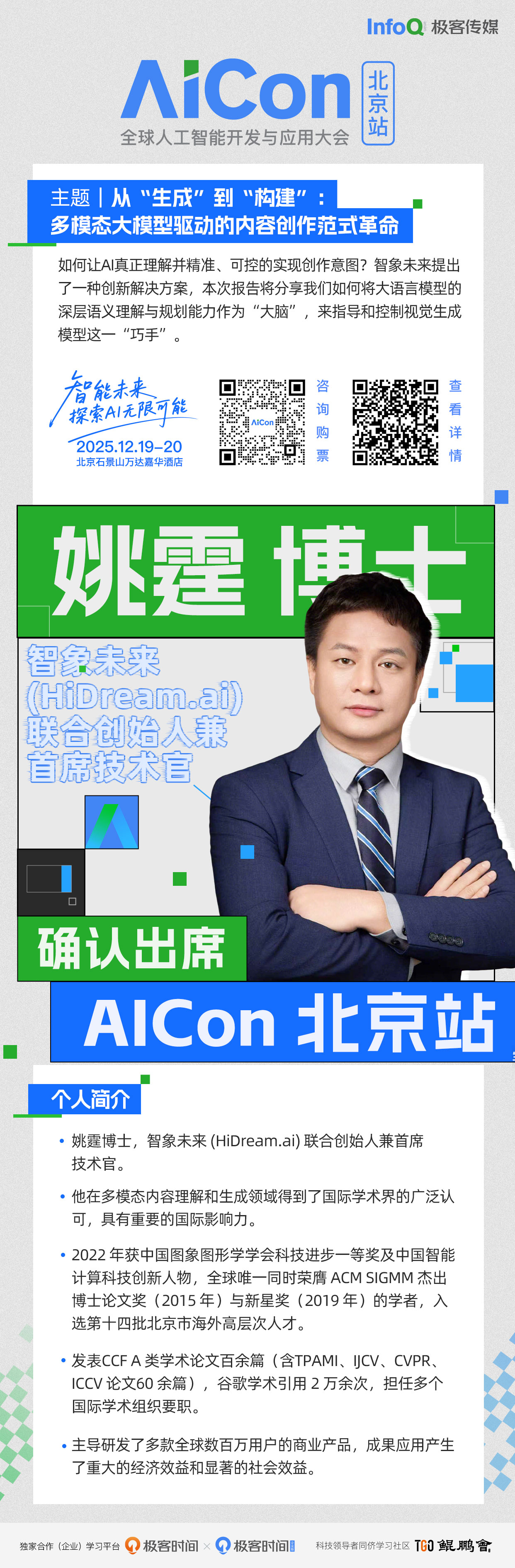 12 月 19-20 日, AICon全球人工智能开发与应用大会收官之站将在北京举办,本次大会 将以 “探索 AI 应用边界” 为主题,聚焦企业级 Agent 落地、上下文工程、AI 产品创新等多个热门方向,围绕企业如何通过大模型提升研发与业务运营效率的实际应用案例,邀请来自阿里、字节、华为、京东、快手、美团等头部企业、大厂以及明星创业公司的专家,带来一线的大模型实践经验和前沿洞察。一起探索 AI 应用的更多可能,发掘 AI 驱动业务增长的新路径!
