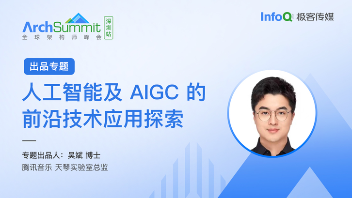 7 月 21 日 - 22 日, 在 ArchSummit 全球架构师峰会(深圳站),腾讯音乐天琴实验室总监吴斌博士,将担任「人工智能及 AIGC 的前沿技术应用探索」的专题出品人,在此次专题中,你将了解到 AIGC 技术的前沿进展,以及这些技术在面向大规模普通用户时的应用与落地。