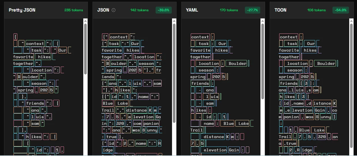 在在线游乐场中运行这个示例,它消耗的令牌与 Pretty JSON 相比减少了 55%,与 compact JSON 相比减少了 25%,与 YAML 相比减少了 38%。