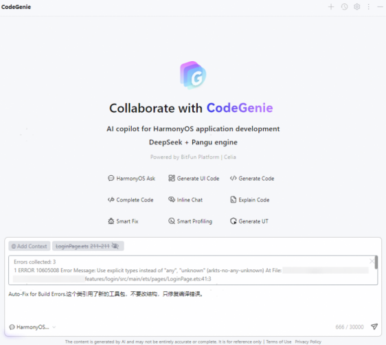 目前,「编译报错 AI 修复」主要专注于 ArkTS 语法错误的修复,且已上线 CodeGenie 6.0 和 5.1 版本,已经准备好加入你的开发工具箱。如果你也经常被编译错误折磨,不妨试试 CodeGenie 的「编译报错 AI 修复」功能。在产生编译构建报错后点一下「Add To Chat」,剩下的交给智能体就行。