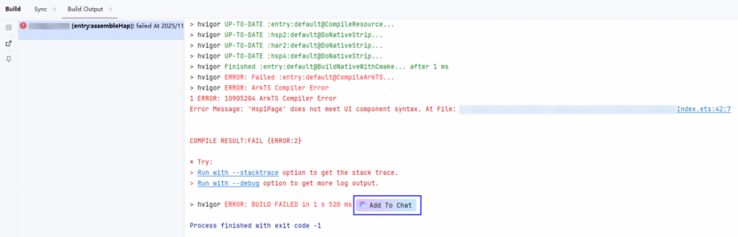 当应用出现编译报错时,控制台会出现醒目的“AddTo Chat”按钮。点击它,当前的报错信息会自动提取到我们的智能插件 CodeGenie 中。
