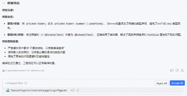 最重要的是,如果第一次修复后编译仍未通过,系统会自动提取新的报错信息,继续分析修复,直到完全通过为止。这种“持续追踪”的能力,让它不同于任何一次性建议工具。
